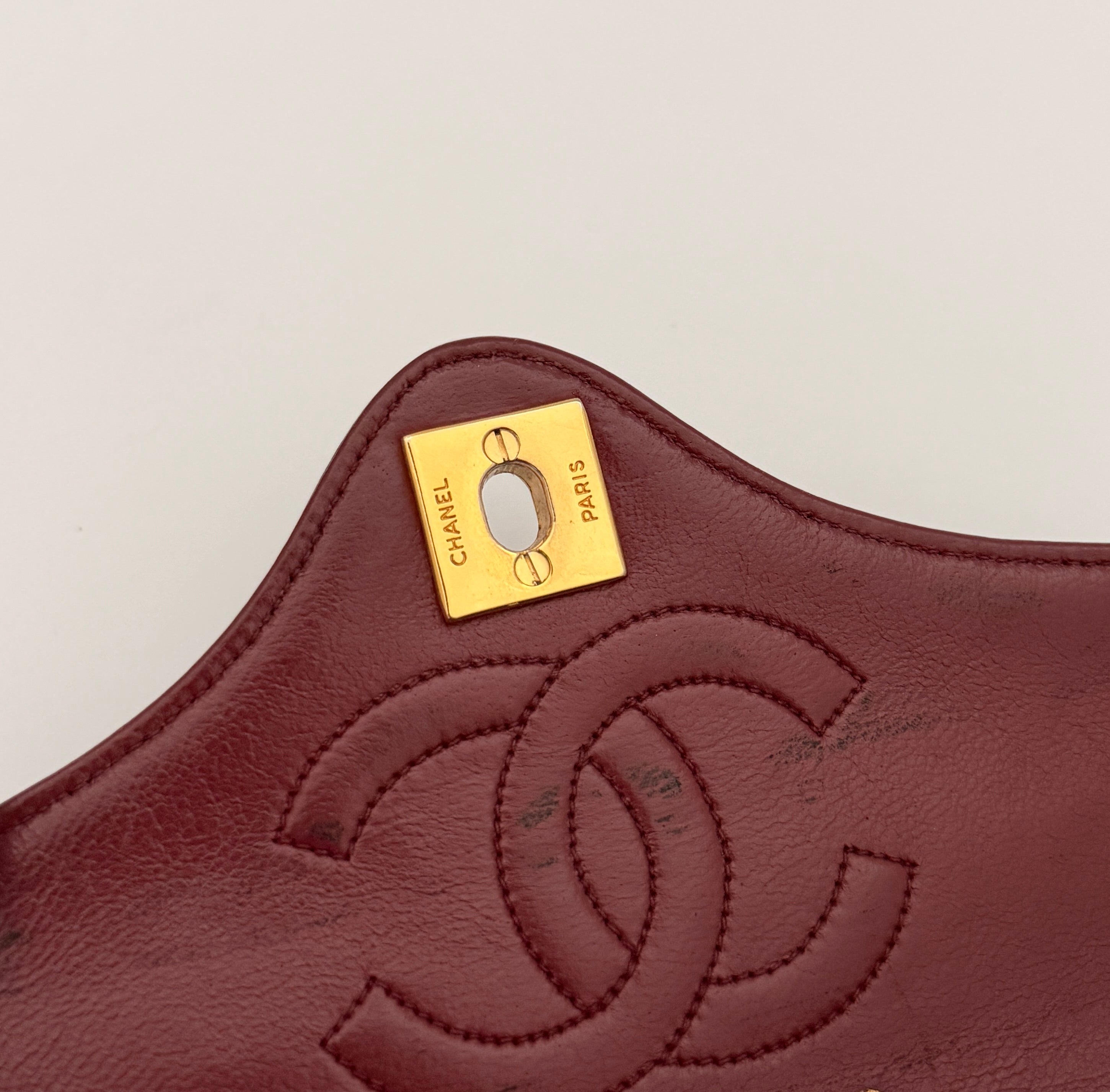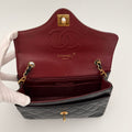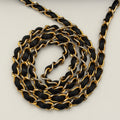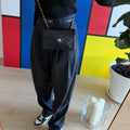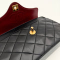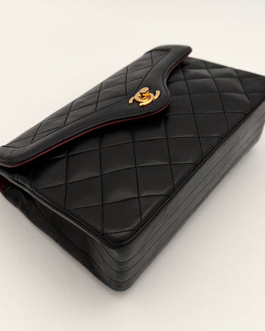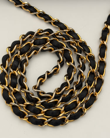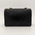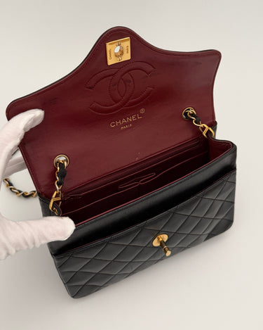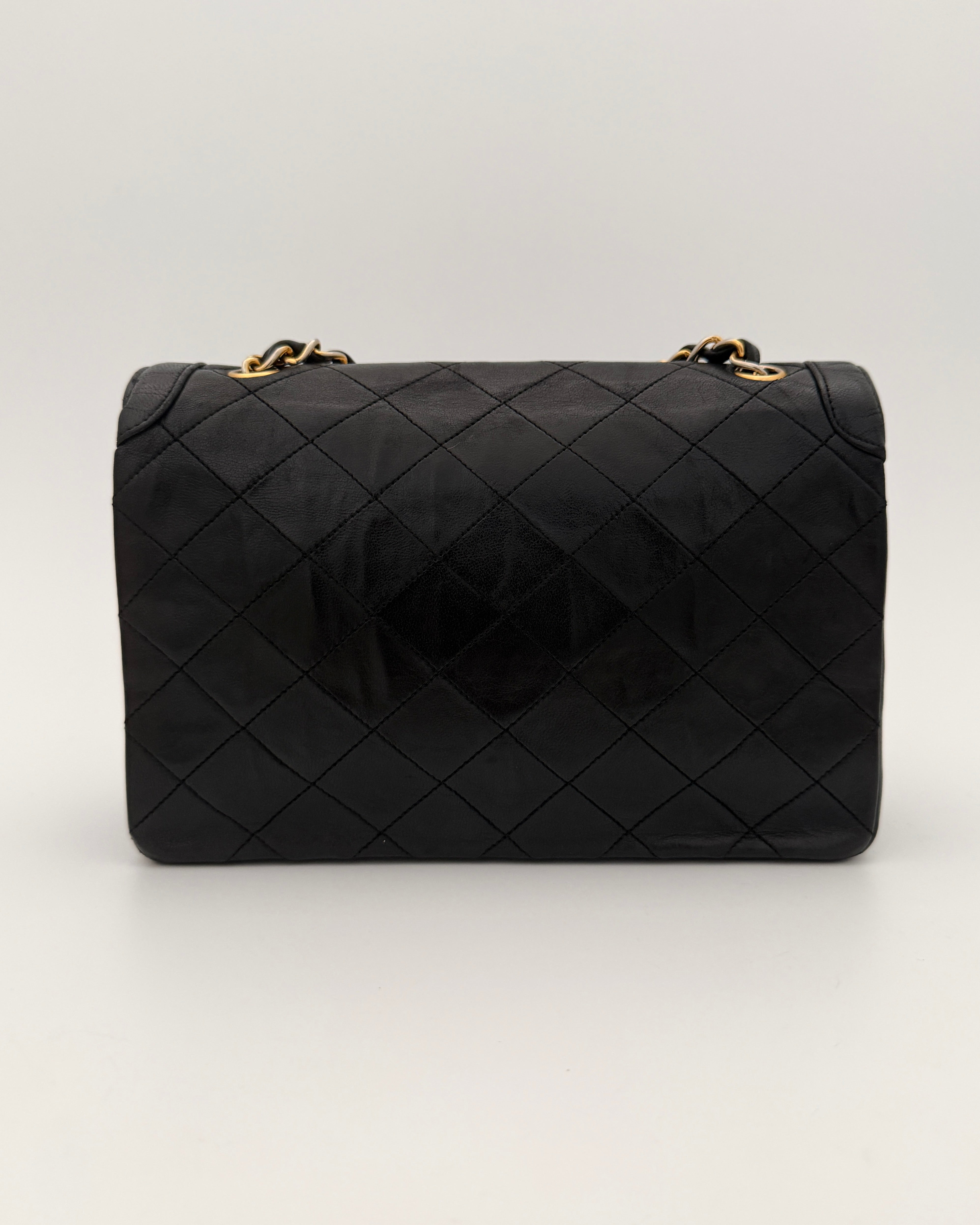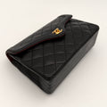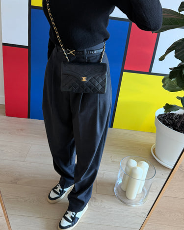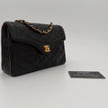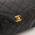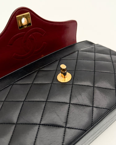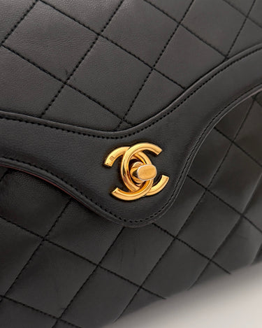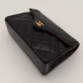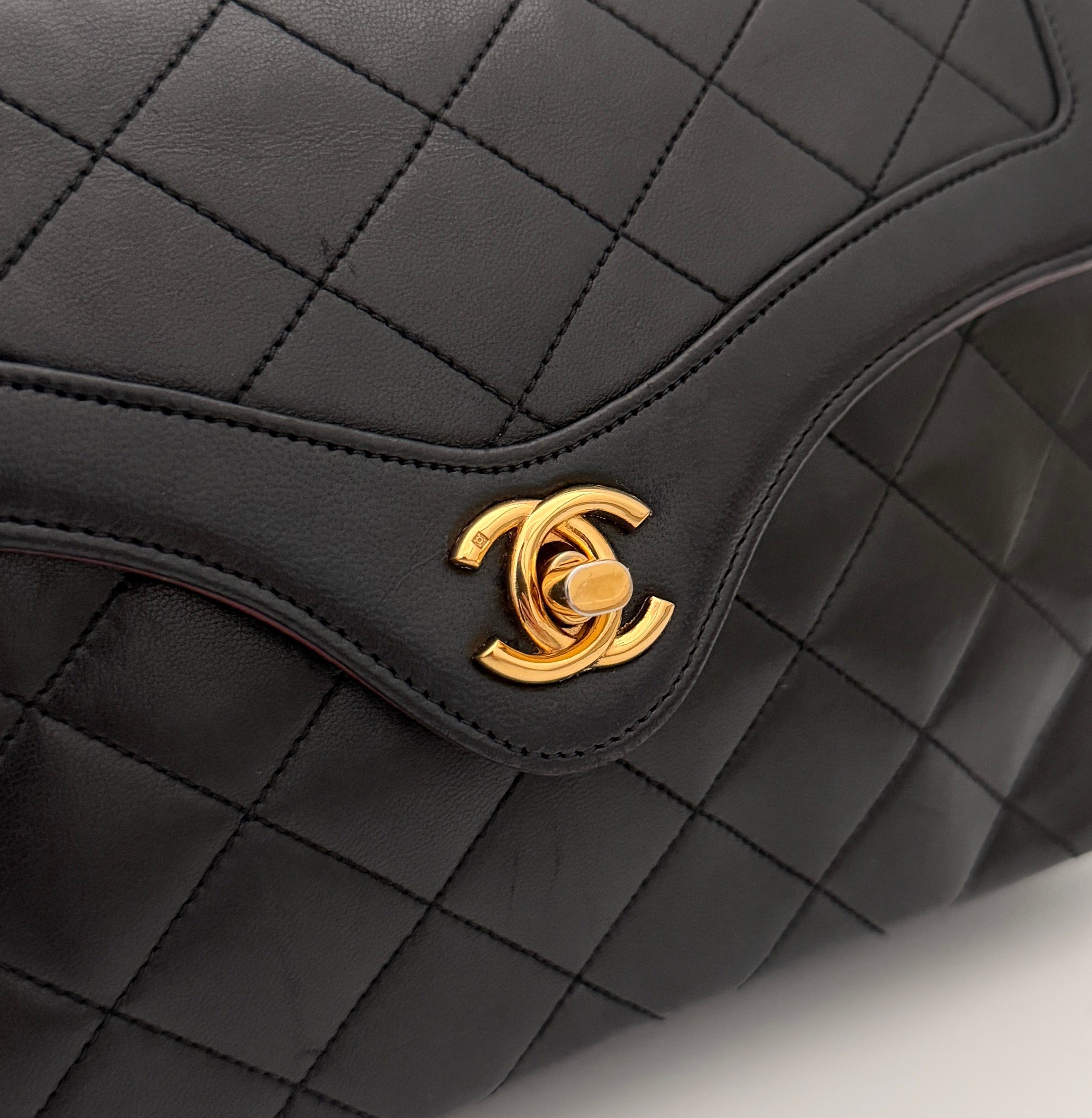 Sac Chanel en cuir noir avec détails métalliques dorés.